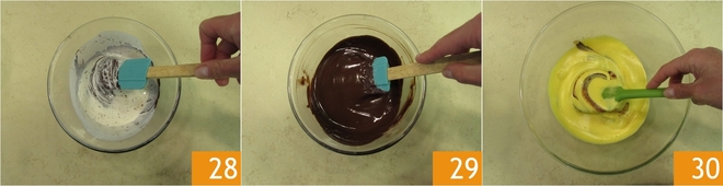 Mélangez avec une spatule après avoir ajouté un peu de crème 28 jusqu'à obtenir une ganache fluide et brillante 29. Laissez tiédir la ganache, puis ajoutez les œufs montés, toujours en 3 fois 30.