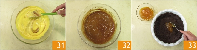Mélangez délicatement de bas en haut 31 jusqu'à ce qu'elle soit complètement incorporée. La mousse est prête 32. Sortez la base du frigo et étalez la confiture d'abricots, préalablement tamisée 33.