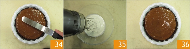 Transférez la mousse à l'intérieur et nivelez-la avec une spatule 34. Couvrez avec un film plastique en contact et placez au réfrigérateur pendant au moins 6 heures. Une fois ce temps écoulé, prenez la crème du frigo et semi-fouettez-la 35, si vous le souhaitez en ajoutant le sucre glace. Sortez le gâteau raffermi du frigo et retirez le film plastique 36.