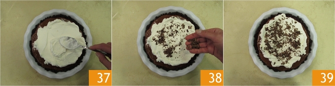 Avec une cuillère, étalez la crème sur la mousse 37 et décorez avec du chocolat noir haché 38. Le gâteau gourmand avec mousse au chocolat est prêt à être servi 39.