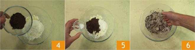 Ajoutez également le cacao 4 et une pincée de sel 5. Pétrissez encore avec les mains 6.