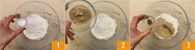 Pour préparer le gâteau maison en pain d'épices, commencez par la pâte des biscuits : dans un bol, mettez la farine 00 avec le bicarbonate 1 et le sucre de canne 2, puis ajoutez une pincée de sel, la muscade et la cannelle 3.