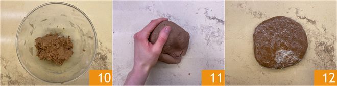 Pétrissez avec les mains d'abord dans le bol 10 puis sur le plan de travail 11. Formez une boule, enveloppez-la dans un film plastique et laissez reposer au réfrigérateur pendant 3 heures 12.
