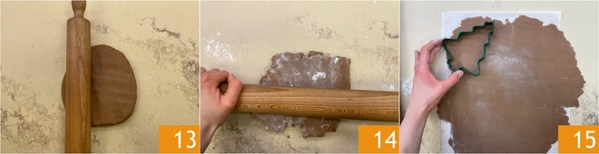 Après le temps de repos, tapez délicatement la pâte avec le rouleau pour la rendre plastique à nouveau 13, puis farinez-la légèrement et étalez-la à une épaisseur d'environ 3 mm 14. Découpez dans la pâte 3 biscuits en forme de sapin de Noël en utilisant des emporte-pièces de différentes tailles 15.