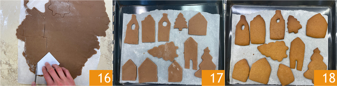 Découpez également 8-9 maisons en utilisant différents patrons 16. Disposez les formes de biscuits sur une plaque recouverte de papier sulfurisé et faites cuire dans un four statique préchauffé à 175°-180° pendant environ 10 minutes, au niveau central 17. Une fois cuits, sortez-les du four et laissez-les refroidir 18.