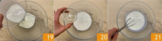 Pour préparer la pâte du gâteau, commencez par le babeurre : dans un bol, versez le yaourt, le lait 19 et le jus de citron 20, puis mélangez avec un fouet 21 et laissez reposer à température ambiante pendant environ 30 minutes.