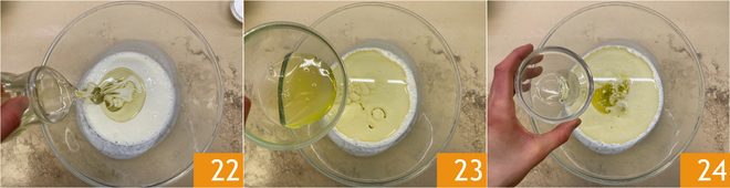 Après ce temps, ajoutez l'huile de graines 22, le blanc d'œuf 23 et le vinaigre 24.