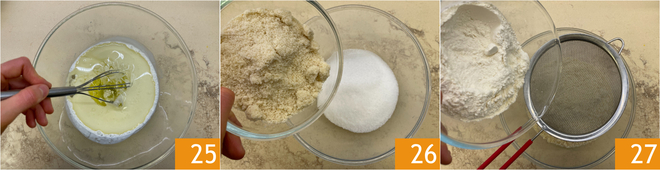 Mélangez avec un fouet pour intégrer les liquides 22 et mettez de côté un moment. Dans un autre bol, combinez le sucre et la farine d'amande 26, puis tamisez la farine 00 27.