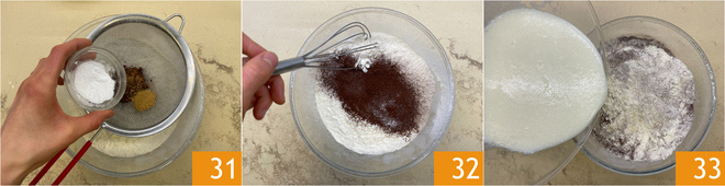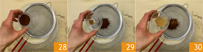 Tamisez dans le bol également le cacao 28, la cannelle 29 et le gingembre 30.