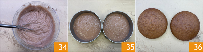 Mélangez bien avec le fouet jusqu'à obtenir un mélange lisse et homogène 34. Divisez équitablement la pâte dans 2 moules à charnière de 20 cm de diamètre, que vous aurez préalablement beurrés et tapissés de papier sulfurisé à la base 35. Faites cuire dans un four statique préchauffé à 180° pendant environ 33-35 minutes, au premier niveau en bas. Vérifiez la cuisson avec un cure-dent, puis sortez du four et laissez refroidir complètement avant de retirer les gâteaux des moules 36.