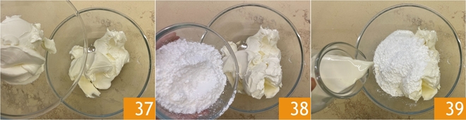 Pour assembler le gâteau, préparez d'abord le glaçage : dans un bol, combinez le mascarpone, le fromage à tartiner 37, le sucre glace 38 et la crème 39.