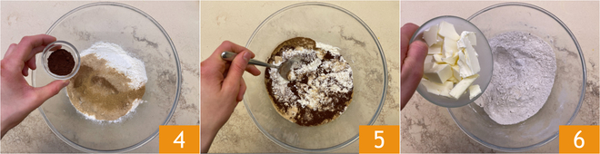 Aromatisez également avec le gingembre et le cacao 4, puis mélangez pour intégrer les poudres 5. Ajoutez maintenant le beurre froid en cubes 6.