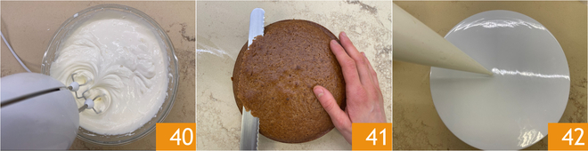 Mélangez bien avec un batteur électrique pour obtenir une crème ferme et homogène 40, puis transférez-la dans une poche à douille sans embout. Une fois que les bases auront complètement refroidi, enlevez la calotte supérieure avec un couteau dentelé pour niveler la surface 41. Prenez le plat de service et pressez un point de crème à la base pour stabiliser le gâteau 42.