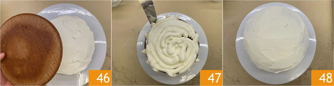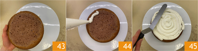 Placez la première base sur le plat 43 et garnissez-la avec une généreuse couche de glaçage 44, puis égalisez avec une spatule 45.