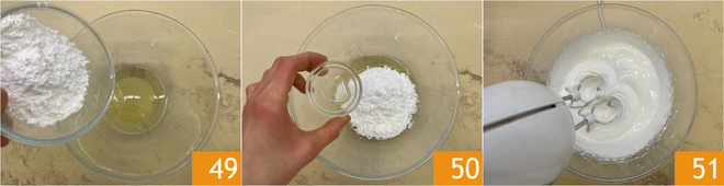 Pour décorer les biscuits, préparez d'abord le glaçage royal : dans un bol, versez le blanc d'œuf, le sucre glace 49 et le jus de citron 50, puis fouettez avec un batteur électrique pendant environ 5 minutes jusqu'à obtenir un mélange ferme et homogène 51.