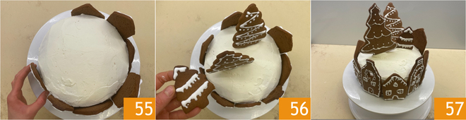 Reprenez le gâteau du réfrigérateur et placez les biscuits en forme de maison le long des bords 55, puis disposez les biscuits en forme de sapin verticalement sur la surface 56. Votre gâteau maison en pain d'épices est prêt à être servi 57 !