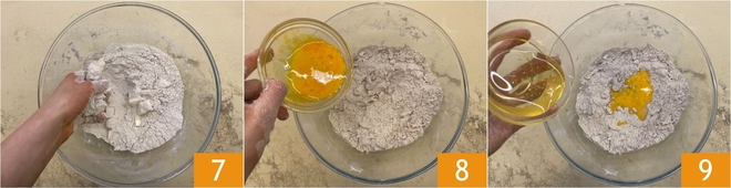 Incorporez le beurre en travaillant rapidement du bout des doigts pour obtenir un mélange sablonneux 7, puis versez l'œuf battu 8 et le miel 9.