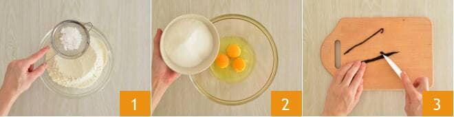 Pour préparer le beignet aux deux chocolats, commencez par tamiser la farine dans un bol puis ajoutez la levure chimique 1. Prenez les œufs et mettez-les dans un bol, puis ajoutez le sucre 2. Prenez la demi-gousse de vanille et, avec un petit couteau, grattez les graines de la gousse 3.