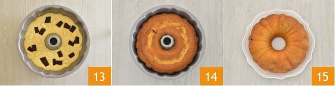 et ajoutez encore 40 g de chocolat noir et 40 g de chocolat blanc 13. Enfournez à 180° pendant 45 minutes. Puis sortez-le du four 14, laissez-le refroidir, puis démoulez-le et transférez-le sur un plat de service.