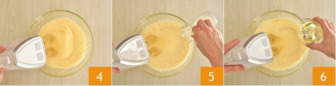 Ajoutez-les au bol avec les œufs et le sucre et commencez à fouetter avec un batteur jusqu'à obtenir un mélange mousseux et clair 4. Ajoutez en filet d'abord le lait à température ambiante 5 puis l'huile en réduisant la vitesse 6.