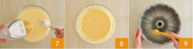Ajoutez peu à peu la farine mélangée à la levure tout en fouettant à basse vitesse 7, vous devez obtenir un mélange lisse et sans grumeaux 8. Beurrez un moule à beignet de 26 cm de diamètre 9.