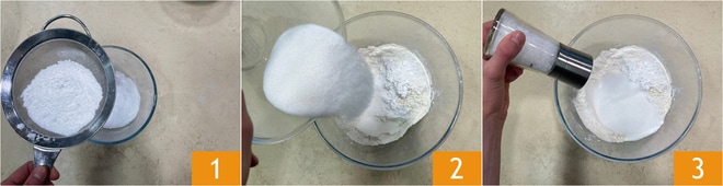 Pour préparer le gâteau margherita sans beurre, dans un bol versez la farine et la fécule tamisées 1. Ensuite, ajoutez le sucre 2, une pincée de sel 3.