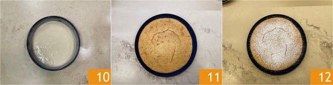 Huilez et farinez un moule de 22 cm de diamètre, versez à l'intérieur la pâte 10, cuisez dans un four statique préchauffé pendant environ 35-40 minutes à 180°C. Faites le test du cure-dents, puis sortez du four 11. Laissez refroidir et saupoudrez ensuite de beaucoup de sucre glace 12 !
