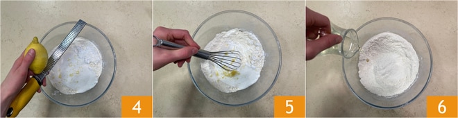 Vous pouvez râper le zeste de citron 4 et mélanger 5. Versez l'huile de graines 6.