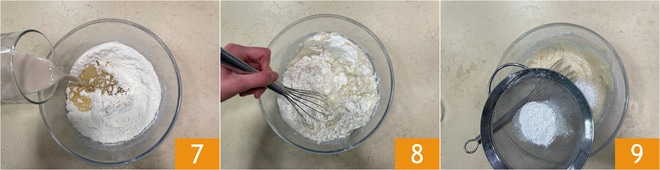 Ajoutez également le lait végétal 7, nous avons utilisé celui de soja. Mélangez et enfin tamisez la levure 9. Mélangez à nouveau pour qu'elle soit absorbée.