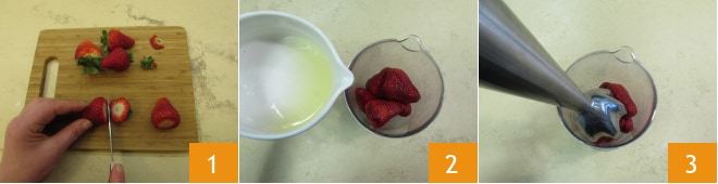 Pour préparer le gâteau moelleux aux fraises, commencez par les laver et enlever le pédoncule 1. Transférez-les dans un récipient haut et étroit, ajoutez le jus de citron 2, mixez avec un mixeur plongeant 3 et réservez.