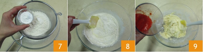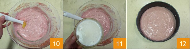 ainsi que la levure 7. Incorporez-les à la pâte, en mélangeant avec une spatule de bas en haut et délicatement aussi dans le sens des aiguilles d'une montre 8. Ajoutez la moitié de la purée de fraises 9