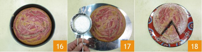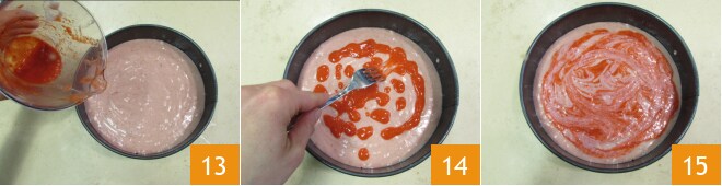 Versez par-dessus la purée de fraises restante 13 et avec une fourchette créez un effet marbré 14 15. Faites cuire dans un four statique préchauffé à 180° pendant environ 55 minutes.