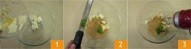 Pour préparer le gâteau moelleux noix de coco et citron vert, dans un grand bol versez le beurre mou 1, le sucre et le zeste de citron vert 2. Travaillez avec un batteur électrique 3.
