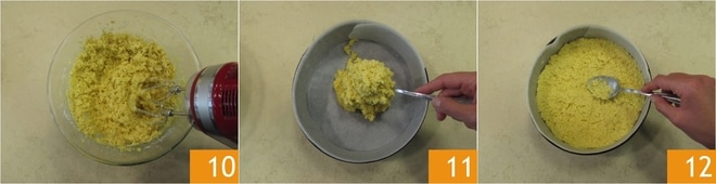 Travaillez la pâte encore quelques secondes 10. Tapissez avec du papier sulfurisé un moule de 21 cm, versez la pâte 11. Versez la pâte 11 et nivelez-la avec le dos d'une cuillère 12. Transférez le mélange dans un moule de 21 cm recouvert de papier sulfurisé. Nivelez délicatement la surface avec une cuillère, décorez avec un peu de noix de coco râpée et enfournez à 150° pendant 45 min. Sortez du four, laissez tiédir. Démoulez