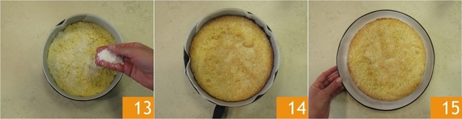 Décorez avec un peu de noix de coco râpée 13 et faites cuire dans un four statique préchauffé à 150° pendant 45 minutes. Sortez du four, laissez tiédir, puis démoulez et dégustez le gâteau moelleux noix de coco et citron vert 15.