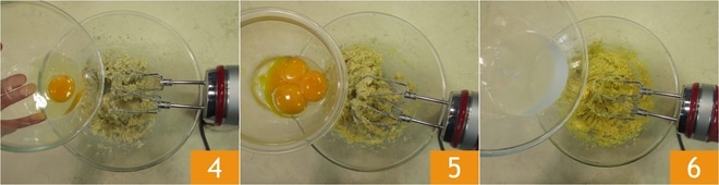 Ajoutez l'œuf entier 4 et mélangez quelques secondes. Ajoutez ensuite les jaunes d'œufs 5 et travaillez jusqu'à absorption complète. Incorporez l'huile de noix de coco en filet 6 laissée à température ambiante, ainsi elle sera fluide et plus pratique à verser.