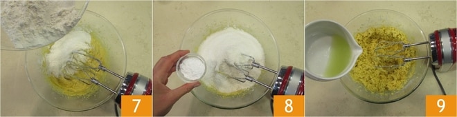 Ajoutez maintenant à la préparation la farine 00 7, la noix de coco râpée et la levure chimique 8. Une fois que vous avez obtenu un mélange homogène et moelleux, versez le jus de deux citrons verts 9.