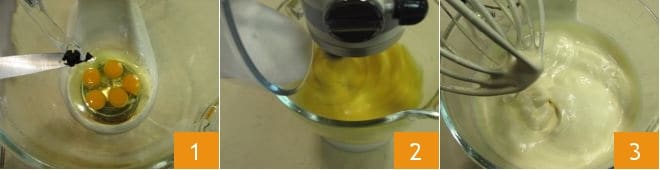 Pour préparer le gâteau à la noix de coco et au citron, commencez par réaliser la génoise. Transférez les œufs dans le bol d'un robot pâtissier, ajoutez les graines de la gousse de vanille 1 et une pincée de sel et commencez à les fouetter avec le fouet à vitesse moyenne. Pendant ce temps, ajoutez le sucre lentement 2 et fouettez les œufs pendant environ 15 minutes jusqu'à ce qu'ils soient gonflés et mousseux.