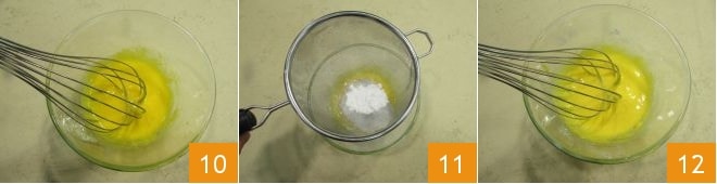 et mélangez rapidement avec un fouet 10. Tamisez l'amidon directement dans le bol 11 et mélangez à nouveau pour amalgamer les ingrédients 12