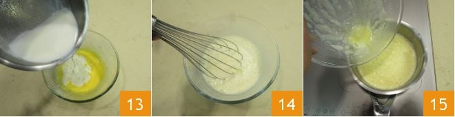Dès que le lait est chaud, versez-le dans le mélange de jaunes 13 et fouettez rapidement avec le fouet 14. Reversez le tout dans la petite casserole 15