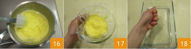 et en mélangeant continuellement, faites cuire la crème jusqu'à ce qu'elle épaississe 16. Placez-la dans un petit bol et couvrez-la avec du film alimentaire 17. Pendant ce temps, faites tremper la gélatine en feuilles dans de l'eau froide et dès qu'elle est ramollie, essorez-la 18
