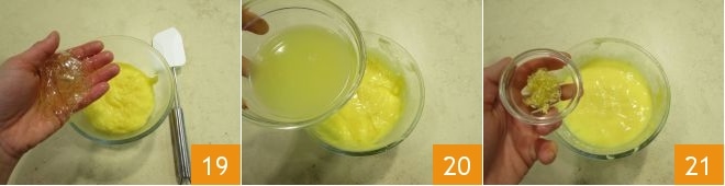 et ajoutez-la à la crème 19, qui ne doit pas être bouillante mais quand même chaude. Ajoutez ensuite le jus 20 et le zeste de citron râpé 21