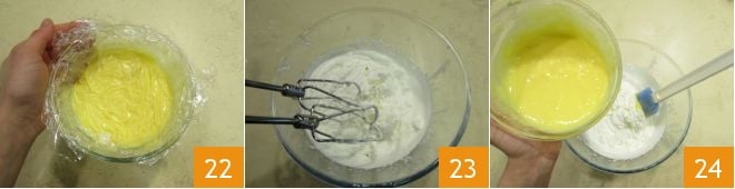 Mélangez bien pour amalgamer le tout, couvrez à nouveau avec du film alimentaire 22 et laissez refroidir complètement. Dès que la crème est froide, montez également la crème 23. Puis ajoutez la crème à la chantilly en deux fois 24