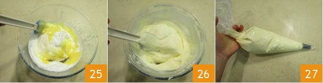 en mélangeant avec une spatule de bas en haut 25, pour ne pas démonter le mélange. Une fois que vous aurez obtenu une crème mousseuse 26, transférez-la dans une poche à douille 27 et conservez-la au réfrigérateur.