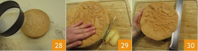 Entre-temps, la génoise aura également refroidi ; démoulez-la 28 et nettoyez-la de la croûte extérieure, aussi bien autour de la circonférence 29 que sur la surface 30