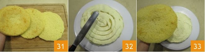 En utilisant un couteau dentelé à longue lame, coupez la génoise en 3 disques de même épaisseur 31. Positionnez le premier sur une assiette de service et placez environ 1/3 de la crème dessus, en l'étalant de manière uniforme 32. Recouvrez avec la deuxième couche de génoise 33
