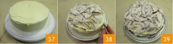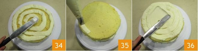 et ajoutez encore une couche de crème 34. Placez le dernier disque et étalez la crème restante à la fois sur la surface et sur les bords 35, et avec une spatule, nivelez la crème 36