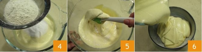 Ensuite, éteignez la machine et tamisez la farine et la fécule directement dans le bol 4. Puis mélangez délicatement en effectuant des mouvements circulaires de bas en haut 5. Dès que vous obtiendrez un mélange homogène, transférez-le dans un moule de 24 cm préalablement beurré et fariné 6