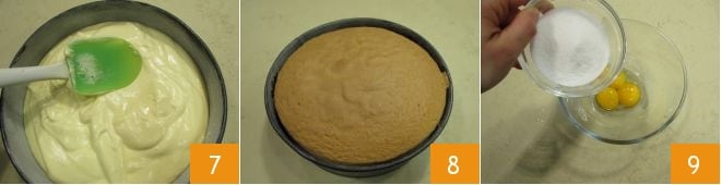 Nivelez délicatement la surface 7 sans frapper le moule sur le plan de travail et faites cuire dans un four statique préchauffé à 160° dans la grille la plus basse pendant environ 50 minutes. Évitez d'ouvrir le four pendant ce temps et avant de retirer le gâteau, vérifiez la cuisson en effectuant toujours le test du cure-dent, car chaque four cuit différemment. En effet, en insérant le cure-dent au centre du gâteau, il doit ressortir complètement sec. Une fois cuit, sortez la génoise du four et laissez-la refroidir 8. En attendant, occupez-vous de préparer la crème. Commencez par chauffer le lait dans une petite casserole, jusqu'à frôler l'ébullition. Placez les jaunes d'œufs dans un bol et ajoutez le sucre 9