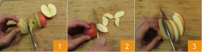 Pour réaliser le gâteau pomme-orange, commencez par faire fondre le beurre à feu très doux et laissez de côté pour le laisser tiédir. Lavez et séchez bien les pommes, puis coupez-les en deux et retirez le trognon 1. Découpez 3 des quatre pommes en fines tranches irrégulières sans les peler 2 ; puis coupez la quatrième pomme en tranches plus régulières, car elles serviront pour la décoration 3.